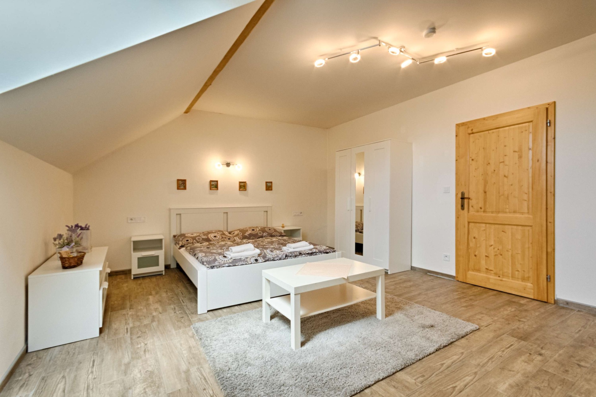 apartmán mám příruční kuchyňku, vlastní sociální zařízení, celkem 4 lůžka a to 1 manželská postel a 2 přistýlky , výhled do dvora i do zahrad, 1 patro , vhodný pro rodiny, obložen dřevem.