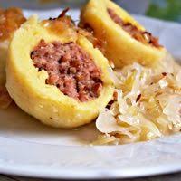Plněný bramborový knedlík uzeným zelí restovaná cibulka